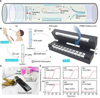 在微流控便携式核酸检测领域取得了重要进展,提出了一种基于水平热对流的全新核酸扩增机制,成功突破了传统方法中单端恒温加热与设备便携化的两大技术瓶颈,为现场即时检测提供了新的解决方案。相关成果以“Integrated Horizontal Convective PCR System for Clinical Diagnostics”为题发表在Science子刊《Science Advances》(Sci. Adv., 11, 32: eadx8434, 2025)上。传统分子诊断技术面临双重困境:一方面是大型中央化检测设备需要样本集中、操作人员专业化以及检测效率低,而另一方面则是便携式设备稳定性差和检测精度不高。因此,开发具有良好环境适应性且高精度的便携式检测设备具有紧迫性。针对上述问题,团队提出基于瑞利-贝纳德对流的水平核酸扩增新机制,实现毛细管单端加热时,溶液受热上升、遇冷下沉,形成稳定对流循环,使核酸分子在密闭空间内自主穿越变性、退火、延伸三温区。同步开发的毛细自装载技术利用液固界面张力,仅需4.5秒即可完成13微升样本吸入与双端密封,彻底消除气泡干扰。配合振动隔离装置,系统在车载颠簸及30°倾斜环境下仍可稳定运行。基于该技术的终端便携式检测设备,可集成于U盘实现超便携检测目标。通过130例临床试验(包括乙肝、新冠、甲流),准确率为96%(图1)。