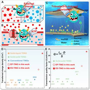 团队与中国科学院北京纳米能源与系统研究所开展合作研究,利用接触起电引发的摩擦诱导极化,实现了对介电固体表面双电层电荷分布与迁移的远程调控;促进不对称双电层形成,从而实现了高效的能量与信息流传递。相关成果分别以“Harnessing triboiontronic Maxwell’s demon by triboelectric-induced polarization for efficient energy-information flow”为题发表在Cell子刊《Joule》(Joule, 9, 5: 101888, 2025)上。尽管针对绝缘介电固体和液体界面的两步法双电层模型(先电子转移后离子迁移)于2019年被提出,然而如何在介电固体表面实现双电层的高效动态调控仍缺乏有效方法,这成为制约该领域发展的重要科学问题。因此,在能量流方面,我们开发了较高电荷密度的摩擦离子电子学(Triboiontronics)纳米发电机。通过优化复合材料中介电基底的电负性和金属薄膜电荷收集层的覆盖率,调节固-液接触起电,实现了双电层电荷密度的有效调控(图2)。在信息流方面,通过调控摩擦诱导极化增强的不对称双电层的相互作用距离,拓展了离子迁移的可控范围,并模拟生物神经系统的并行处理与传递机制(不同价态离子可携带差异化信息),实现了高效的自驱动水下无线信息传输。此外,团队将液固接触带电效应与Leidenfrost效应相结合,首次揭示了二者的内在联系。以“Probing Leidenfrost effect via contact electrification”为题发表在一区Top期刊《Nano Energy》(Nano Energy, 134: 110570, 2025)上。