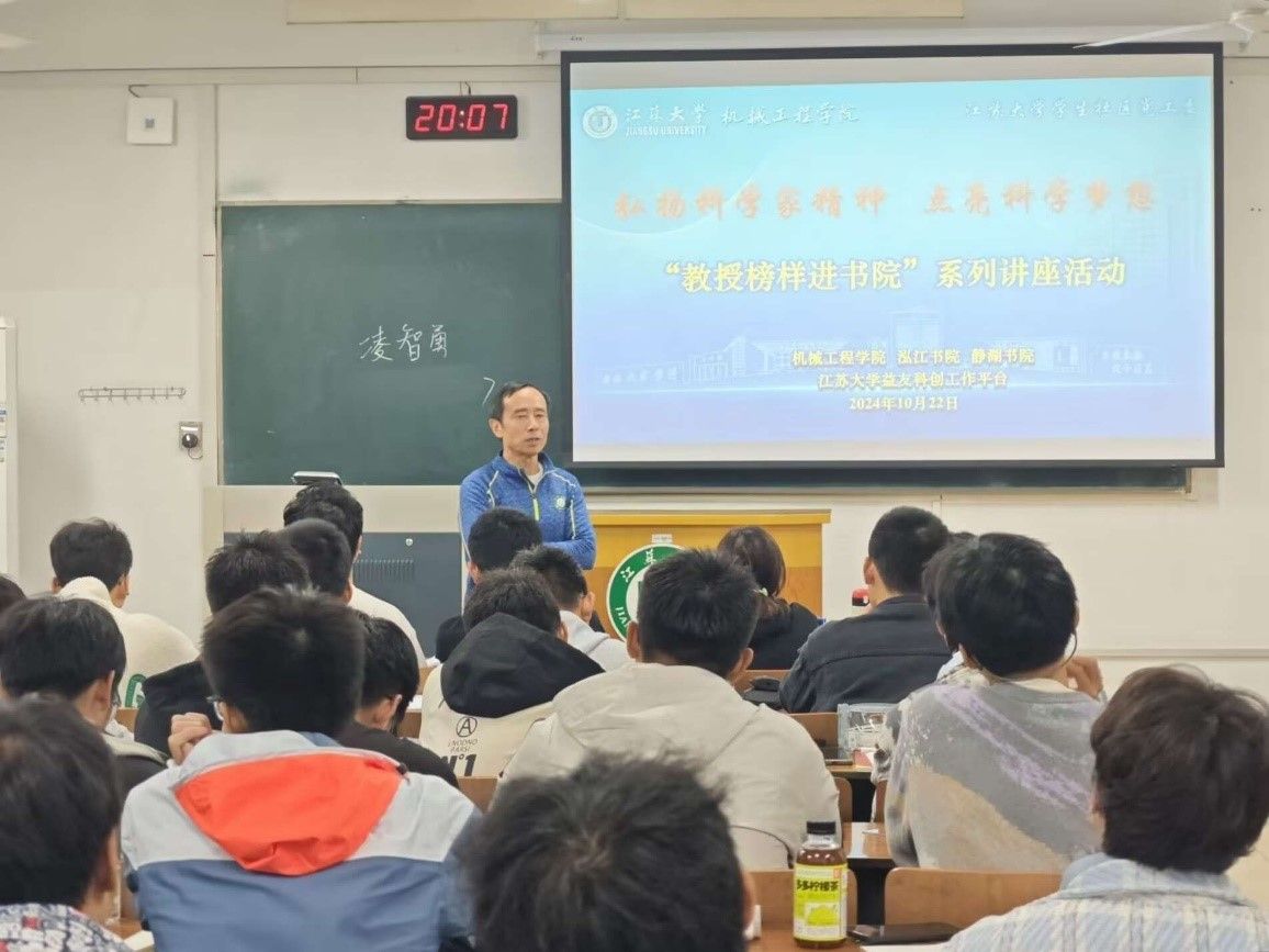 On October 22, relying on the “Yiyou” science and innovation workstation of Jiangsu University, the School of Mechanical Engineering, in cooperation with Jiangsu University Community Party and Work Committee, Hongjiang Academy and Jinghu Academy, carried out the theme of “Role Model Professors in the Academy” in the classroom 319 of Sanshan Building to carry forward the spirit of scientists, and invited Ling Zhiyong, a famous teacher of the university and a veteran teacher of the Committee, to give a lecture. The lecture invited Ling Zhiyong, a famous teacher and a veteran teacher of the Committee of Workers' Concern, to give a lecture, which was attended by some students of the college and the academy.